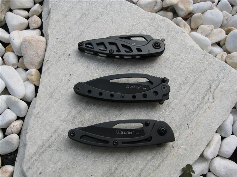今回 DX でみかけた UltraFire ブランドのナイフが私の好みのデザインだったので、701A, 702A, 703A の 3 本を買ってみました。701と701Aの違いは GERBER で言うところの Fine Blade (普通の直刃)と、Serrated Edge (ギザギザ刃) の違いです。特に実用目的はなく、コレクションの一環なので、見た目にかっこいい(?)方を買いました w