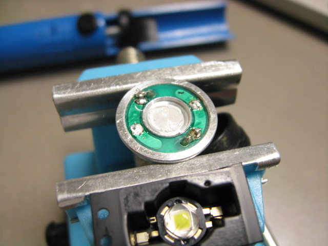 若干 SSC P4 エミッタのほうが Luxeon III に比べると、大きいような気がするので、本来はもう少しリフの中央の穴を削った方がいいのかもしれませんが、面倒なのでこのまま。