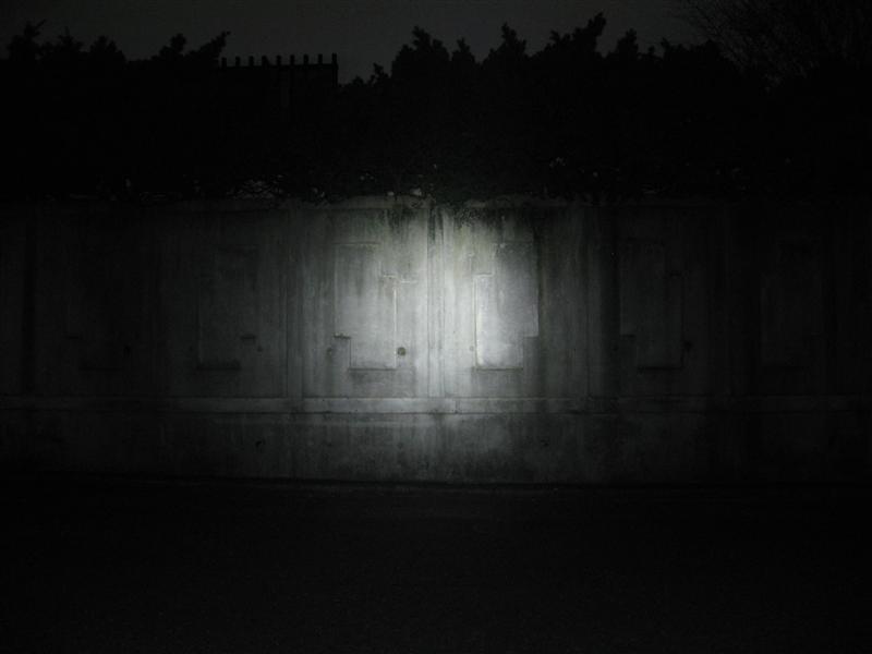 私が使ってるデジカメは IXY 800IS なんですが、コンパクトカメラの部類なので、シャッター速度を固定できても1秒以上しか設定できません。今回のライトはLuxeon 5Wクラス(?)でしたが、照射先を遠くに設定してみたので、6m塀と同じ、ISO200 シャッター速度1秒固定でなんとなく、っぽく撮れたんじゃないでしょか。。。