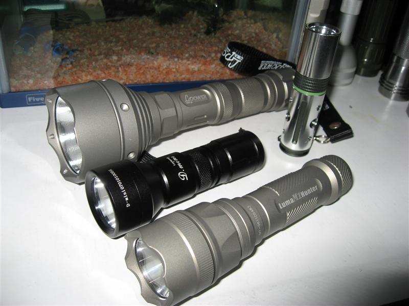 手前から M1 XR-E, D-mini, DX1 5W で、たってるシルバーのライトが F1 です。