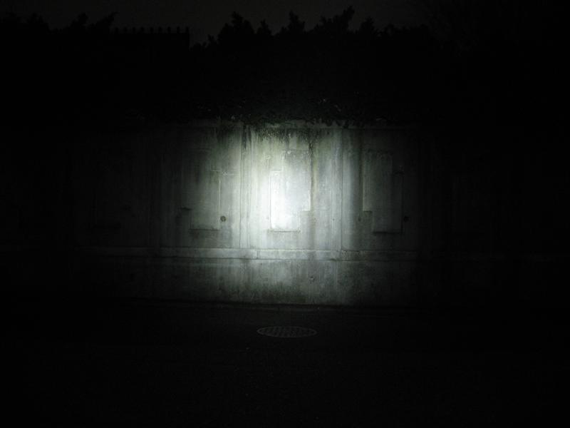 バッテリーを充電、照射パターンを撮るべくおうちの回りを徘徊。。。 街灯の光のあまり届かない路地を発見、汚れたコンクリート塀だけど、とりあえず激写