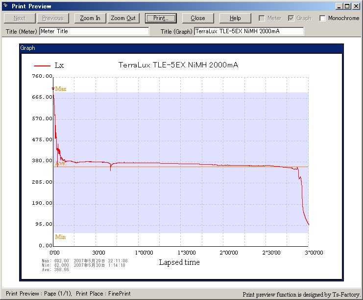 TLE-5EX については、先回 TLE-5K2 のランタイムを計測 しているのと、購入元の中の人の CPF への書き込みから、TLE-5 と同じ回路で LED を変更した程度、ということでしたので、ランタイムについてはある程度予測していたのですが、SSC については熱だれというんでしょうか、温度に対して出力が低下する、というお話をいろいろと目にするので、念のためランタイムを測ってみました。