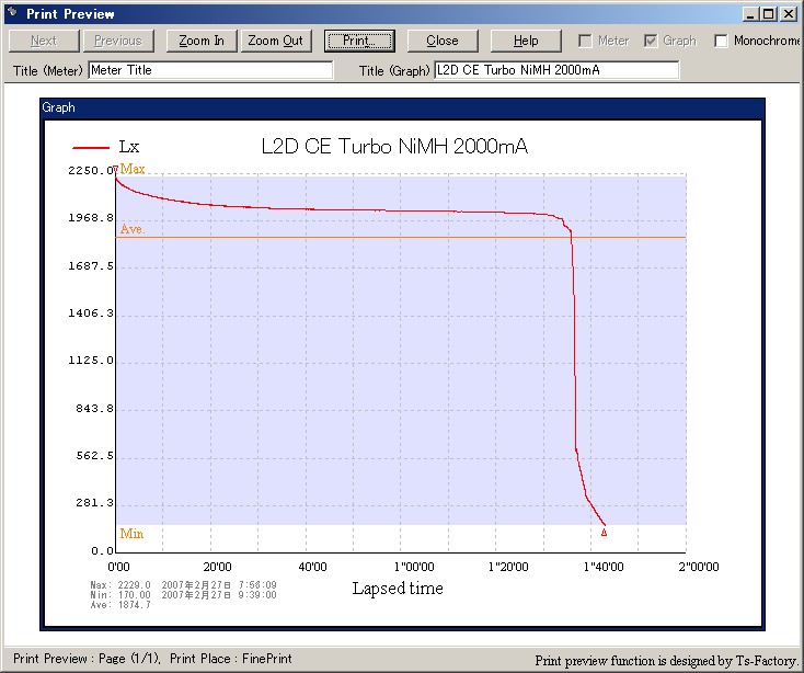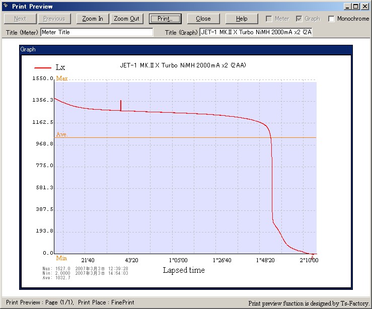 メーカのスペックでは(おそらく)2500mA の NiMH 使用時に 80lm 時 4 時間、135 lm 時 2 時間 40 分のアナウンスですが、2000mA のエネループで、それぞれ 3 時間 20 分、1 時間 35 分という結果はどうでしょう ?