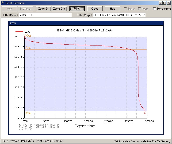 それで、この 2AA の状態でなら ENELOOP x 2 で 2.6V くらいは確保できるので、Max (ジェネラルの最大), Turbo (アドバンスの最大)でのランタイムを測ってみました。