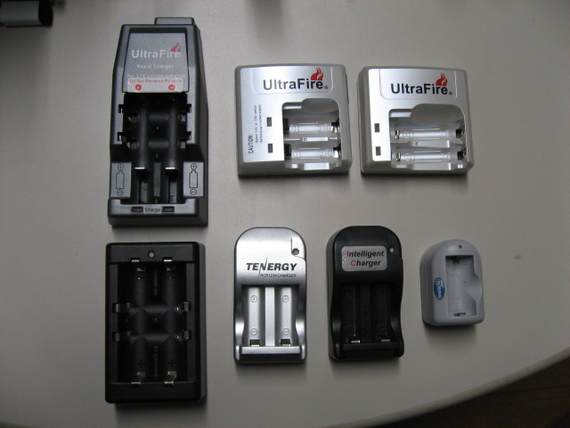 ちょっと手持ちの Li-ion 充電器達を並べてみました。まだ他にもあるんですけど、入手先が不明なものとかもありますので、比較的素性のしっかりしたもので紹介できるものを集めてみました。