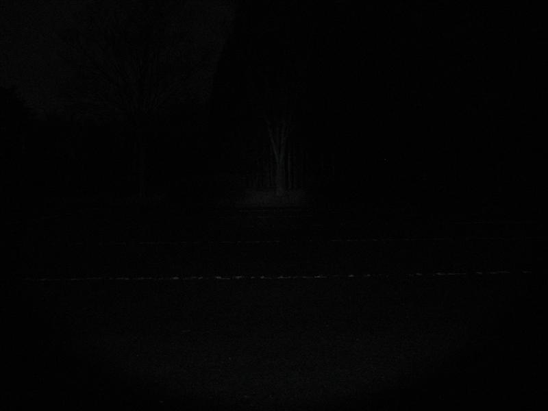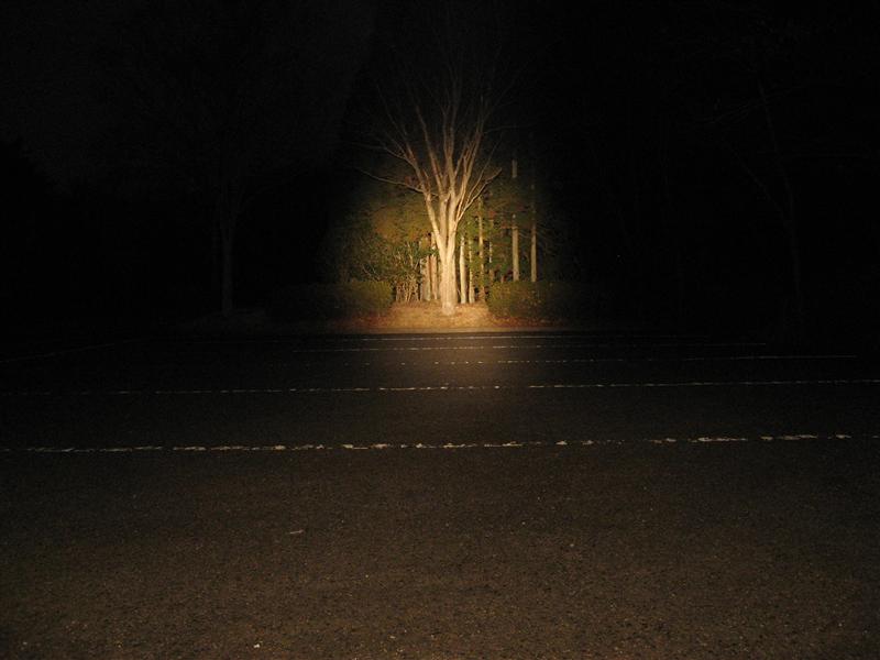 まっくらな駐車場で、写真中央の立木までは約25mといったところ
