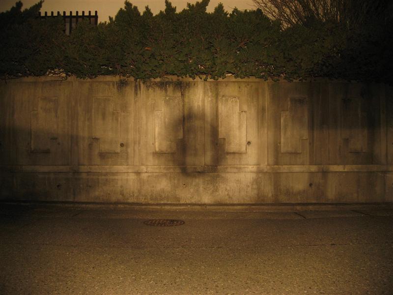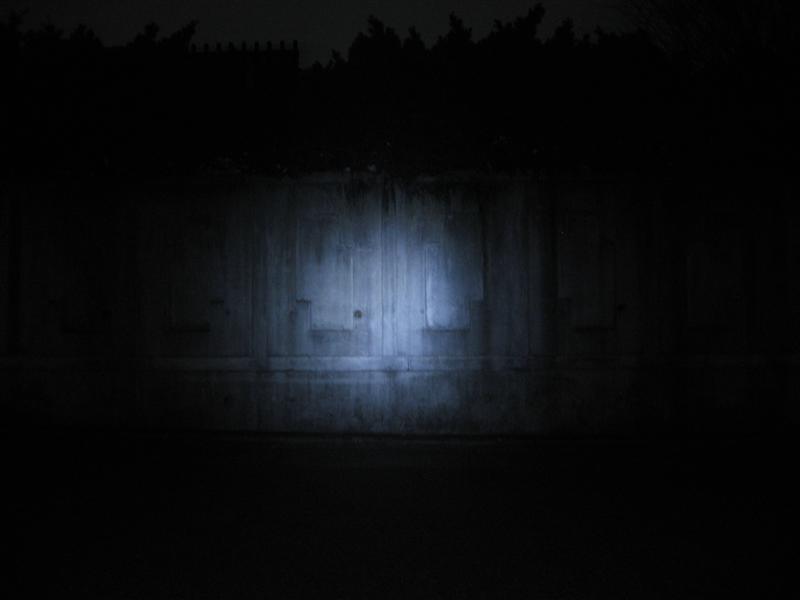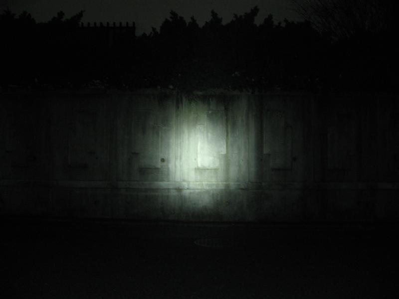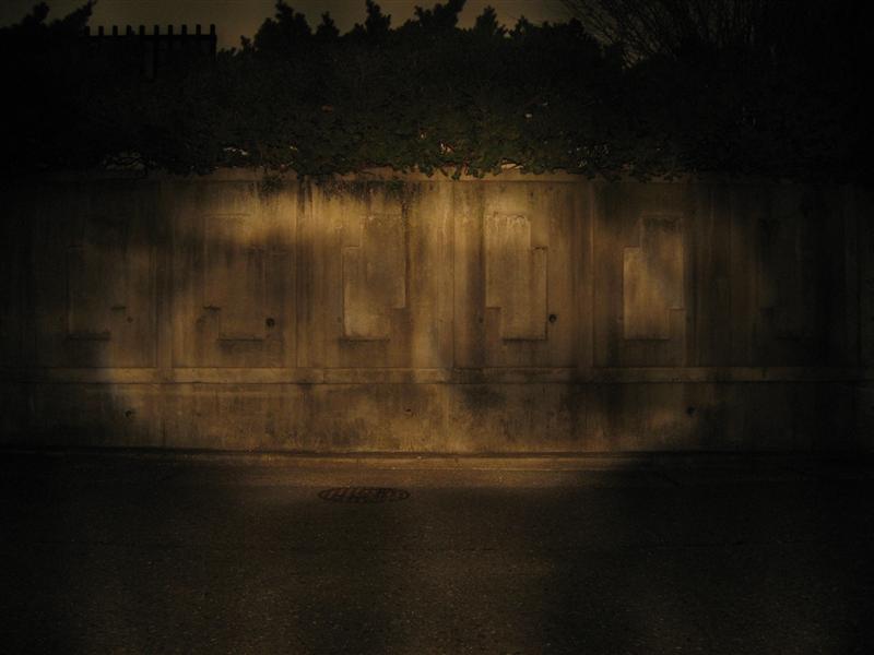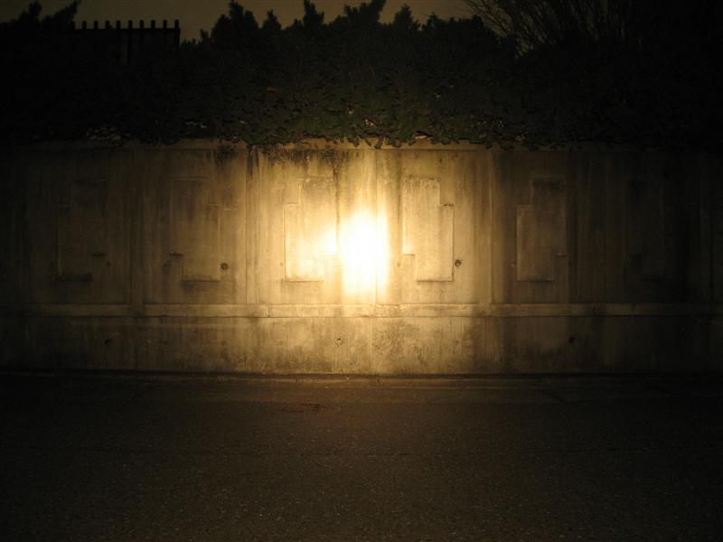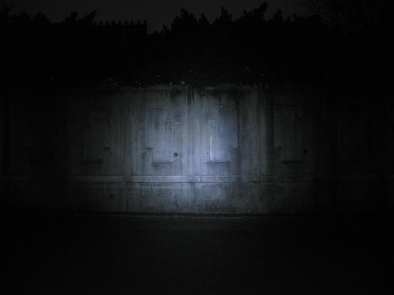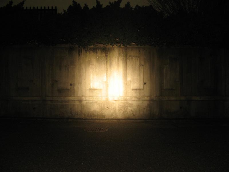 バッテリーを充電、照射パターンを撮るべくおうちの回りを徘徊。。。 街灯の光のあまり届かない路地を発見、汚れたコンクリート塀だけど、とりあえず激写
