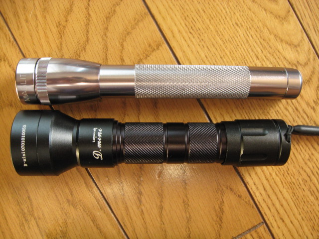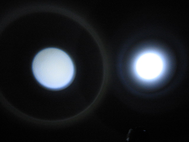 左が LENSER 500GS で、右が GENTOS ジュピナです。これまた、右のはサチっちゃってるので、単純比較はできないのですが、○の明るさと大きさを同じになるように距離を調節していくとだいたい距離で2倍とちょっと離れたところで見た目に同じくらいになるので、ちょっと乱暴ですが明るさで5-6倍くらいじゃないかと。。。