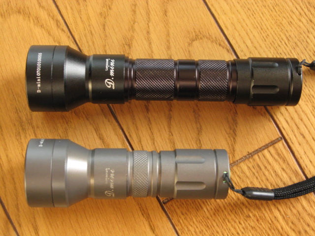 黒 D-mini にとりつけたところ、大きさ比較のためにミニマグ(ノーマル)との比較写真です。