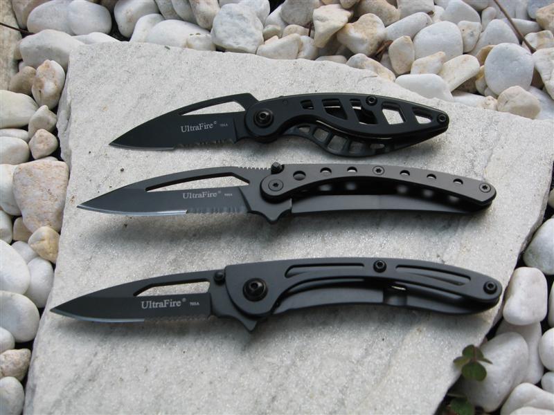 今回 DX でみかけた UltraFire ブランドのナイフが私の好みのデザインだったので、701A, 702A, 703A の 3 本を買ってみました。701と701Aの違いは GERBER で言うところの Fine Blade (普通の直刃)と、Serrated Edge (ギザギザ刃) の違いです。特に実用目的はなく、コレクションの一環なので、見た目にかっこいい(?)方を買いました w