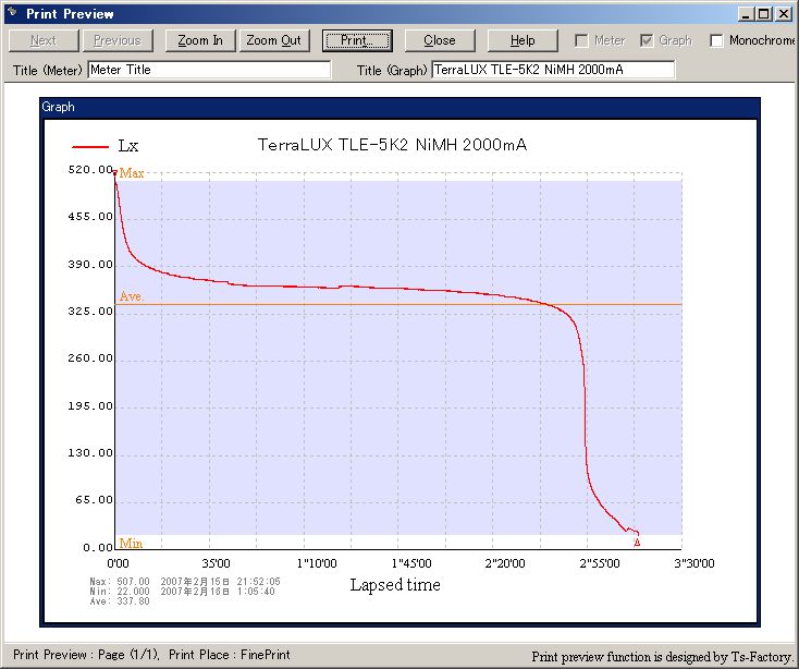 L1D CE のときは公式スペックには少し及ばなかったのですが、FENIXの場合はたぶん 2500mA NiMH だと思うので、エネループの 2000mA での私の計測は結構妥当なんじゃないかと思ってます。